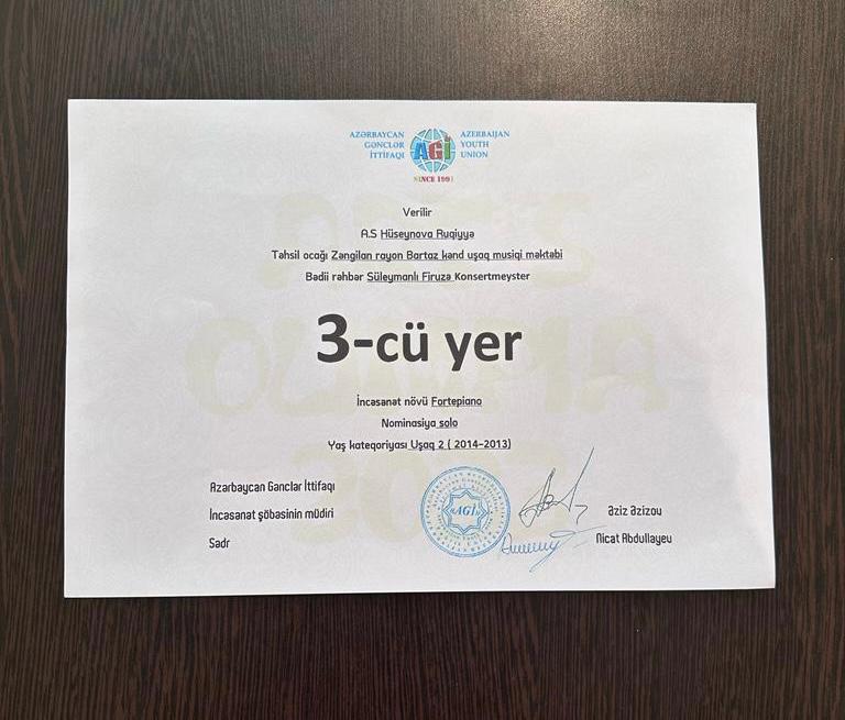 Sumqayıt Regional Mədəniyyət İdarəsinə tabeli Zəngilan rayon Bartaz kənd Uşaq Musiqi Məktəbinin 3-cü sinif şagirdi Ruqiyyə Pərviz qızı Hüseynova Azərbaycan Gənclər İttifaqının təşkilatçılığı ilə keçirilən "Arts Olimpia" adlı Uşaq İncəsənət Müsabiqəsində uğurla çıxış edərək, müsabiqənin III yerinə layiq görülüb.