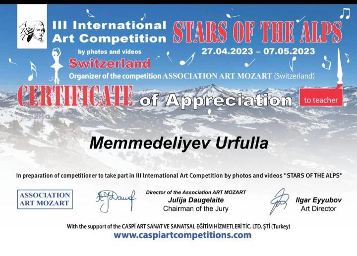 Sumqayıt Regional Mədəniyyət İdarəsinə tabeli Abşeron rayon Mehdiabad qəsəbə Uşaq Musiqi Məktəbinin 1-ci sinif şagirdləri Əsra Bəbirova və Zərrin Quliyeva İsveçrədə onlayn keçirilən "STARS OF THE ALPS" Beynəlxalq müsabiqədə iştirak edərək III yerə layiq görülüblər. Müsabiqədə şagirdlər duet şəklində məşhur İtalyan bəstəkarı və müğənnisi Eduardo Di Kaprianın "O sole mio" əsərini ifa ediblər. Onları fortepianoda məktəbin 5-ci sinif şagirdi Ayan Quliyeva müşayət edib. Şagirdləri müsabiqəyə məktəbin skripka ixtisası üzrə müəllimi Urfulla Məmmədəliyev, fortepianoda isə məktəbin fortepiano ixtisası üzrə müəllimi Gülnarə Rüstəmova hazırlayıblar.