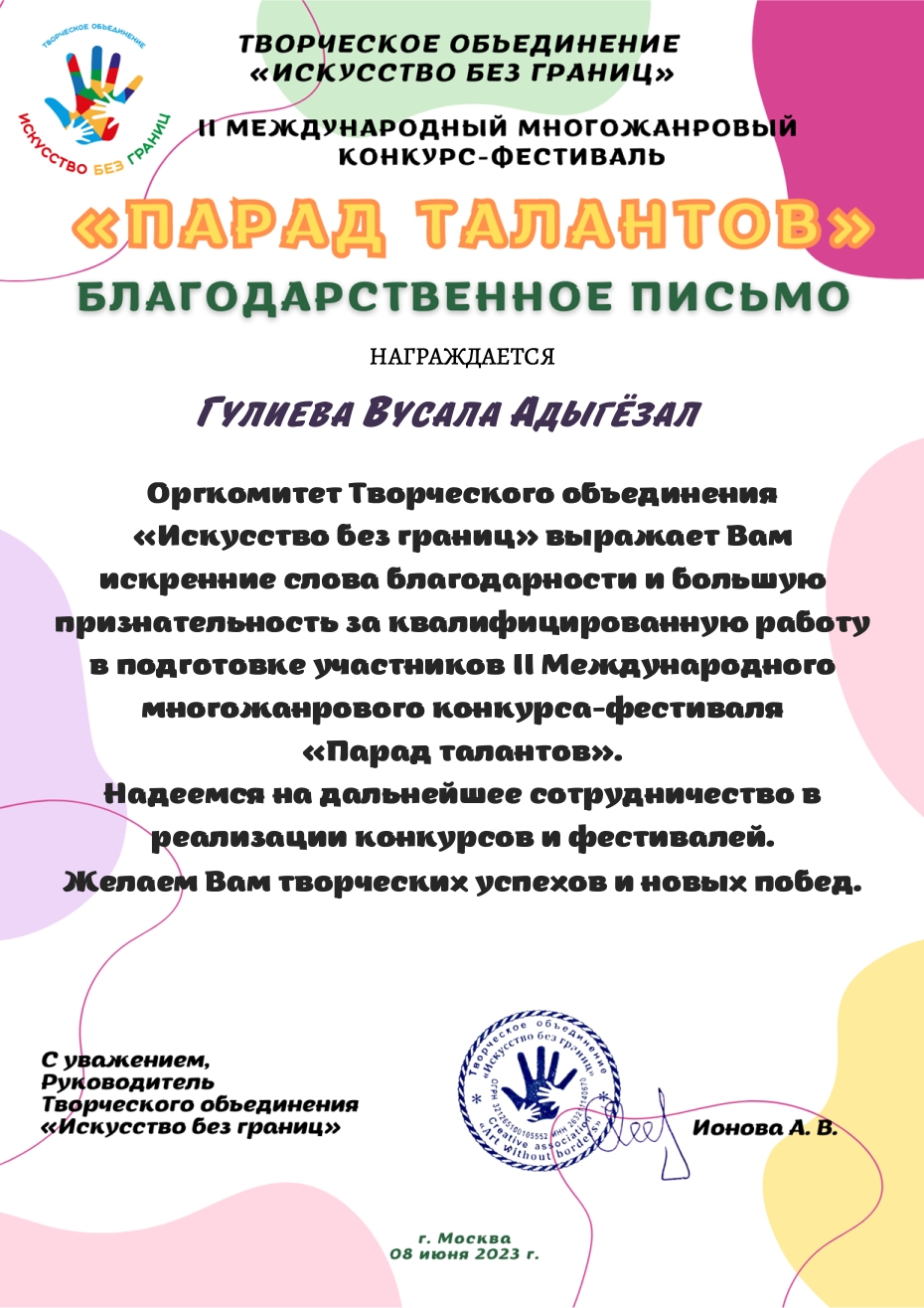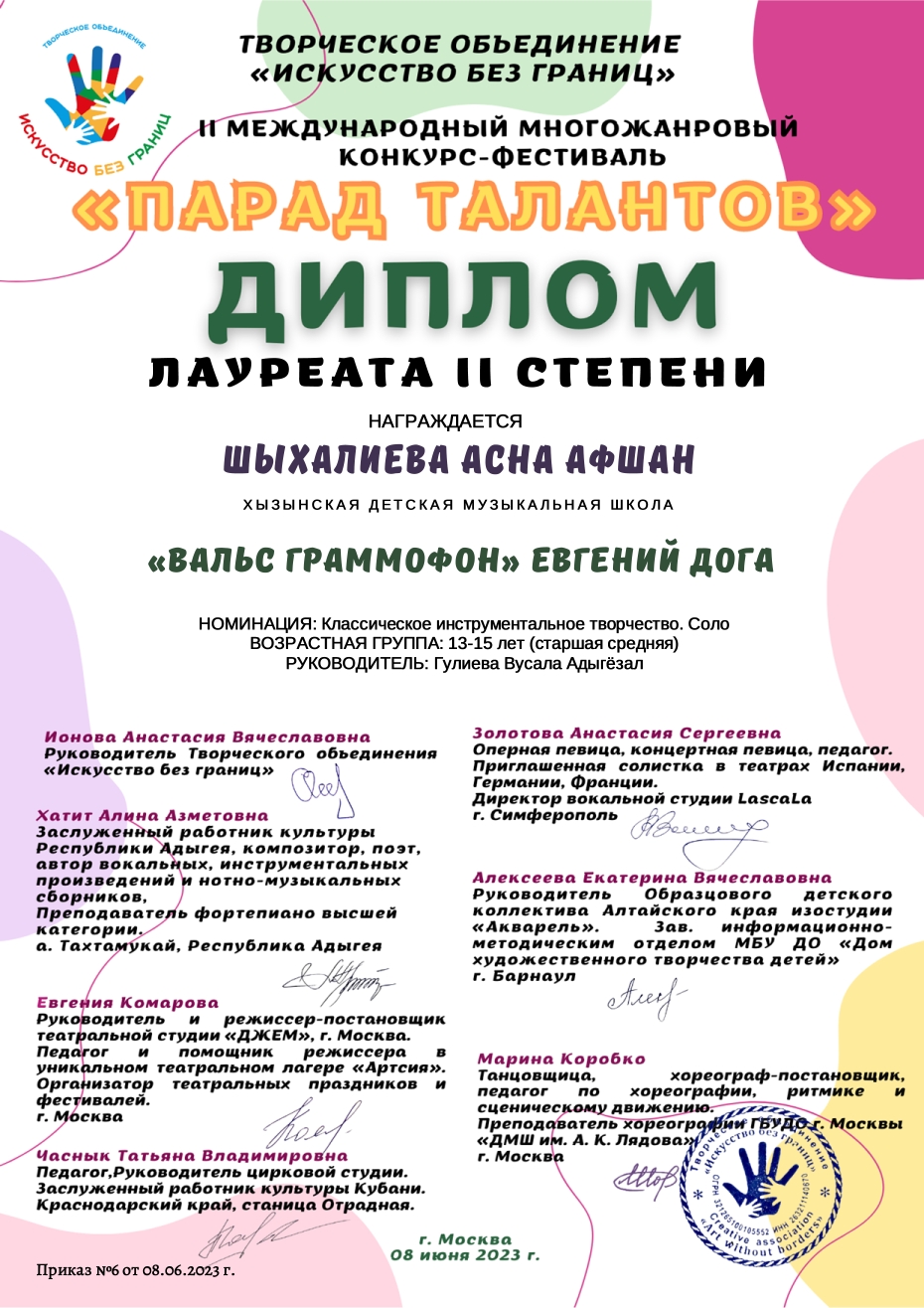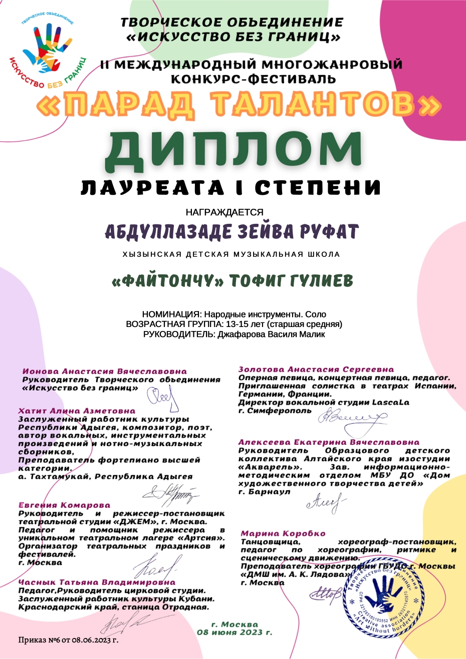 Rusiya Federasiyasının Moskva şəhərində “Sərhədsiz İncəsənət” Yaradıcılıq Birləşməsinin təşkilatçılığı ilə keçirilən II Beynəlxalq çoxjanrlı “İstedadlar Yürüşü” müsabiqə-festivalında Sumqayıt Regional Mədəniyyət İdarəsinə tabeli Xızı rayon Uşaq Musiqi Məktəbinin fortepiano ixtisası üzrə 6-cı sinif şagirdi Əsna Əşrəf qızı Şıxəliyeva II dərəcəli Laureat, Qarmon ixtisası üzrə 4-cü sinif şagirdi Zeyvə Rüfət qızı Abdullazadə I dərəcəli Laureat adına layiq görülüblər. Müəllimləri Vüsalə Quliyeva və Vəsilə Cəfərova Təşəkkürnamə ilə təltif ediliblər.